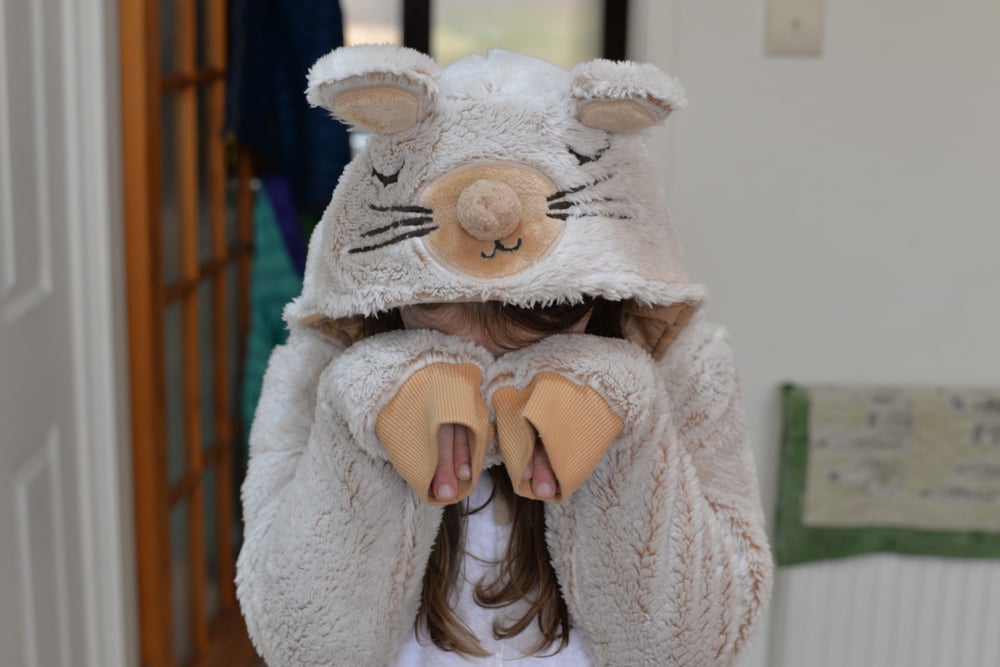 As it turns out, Sonya often lazed around in her mouse onesie at home, and Rupert grew to cherish and love her scent on the onesie. Sonya had the idea that her scent on the suit might override the vet’s scent, thereby making Rupert much more comfortable. This was a great idea because as soon as the vet put the suit on, Rupert instantly relaxed.